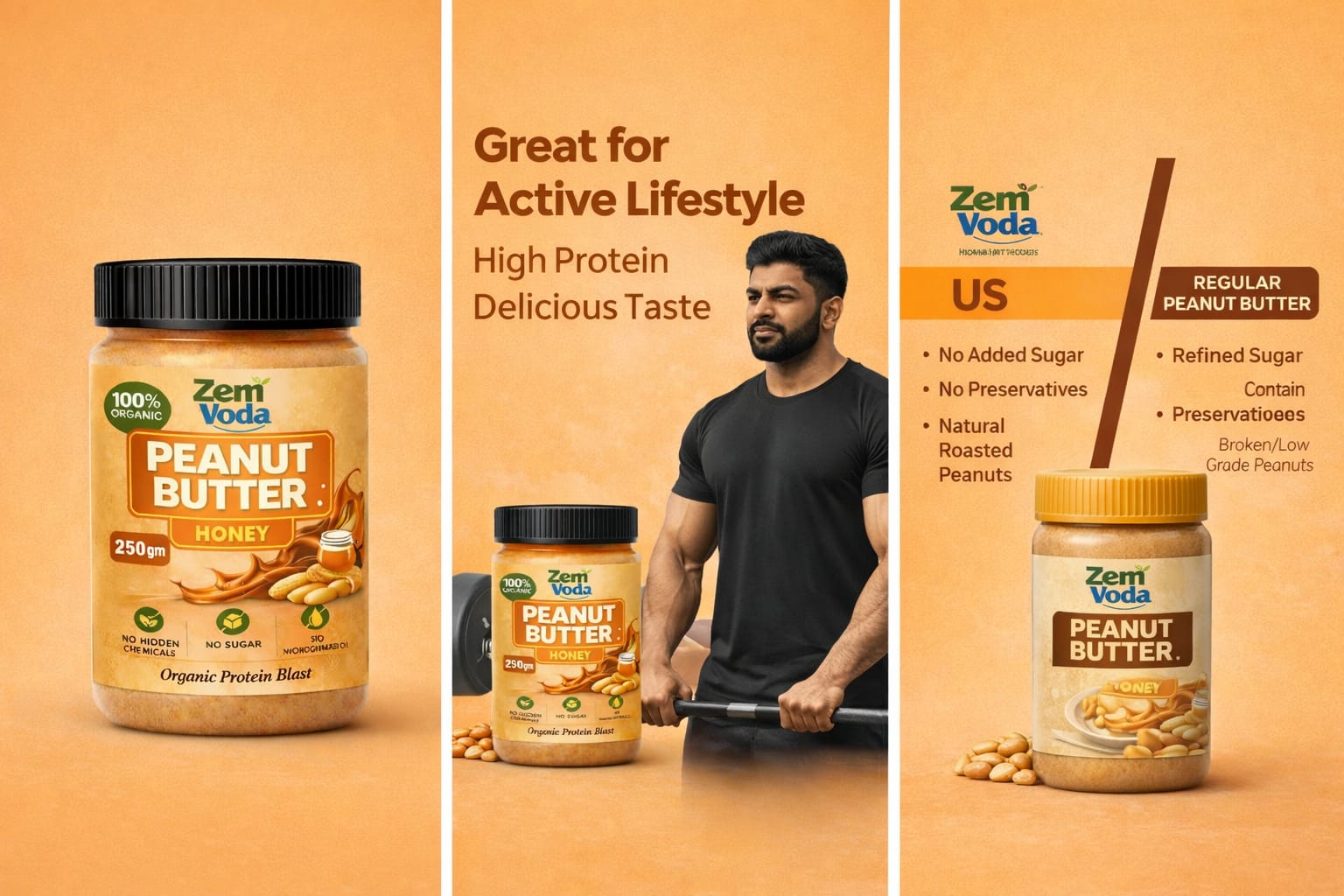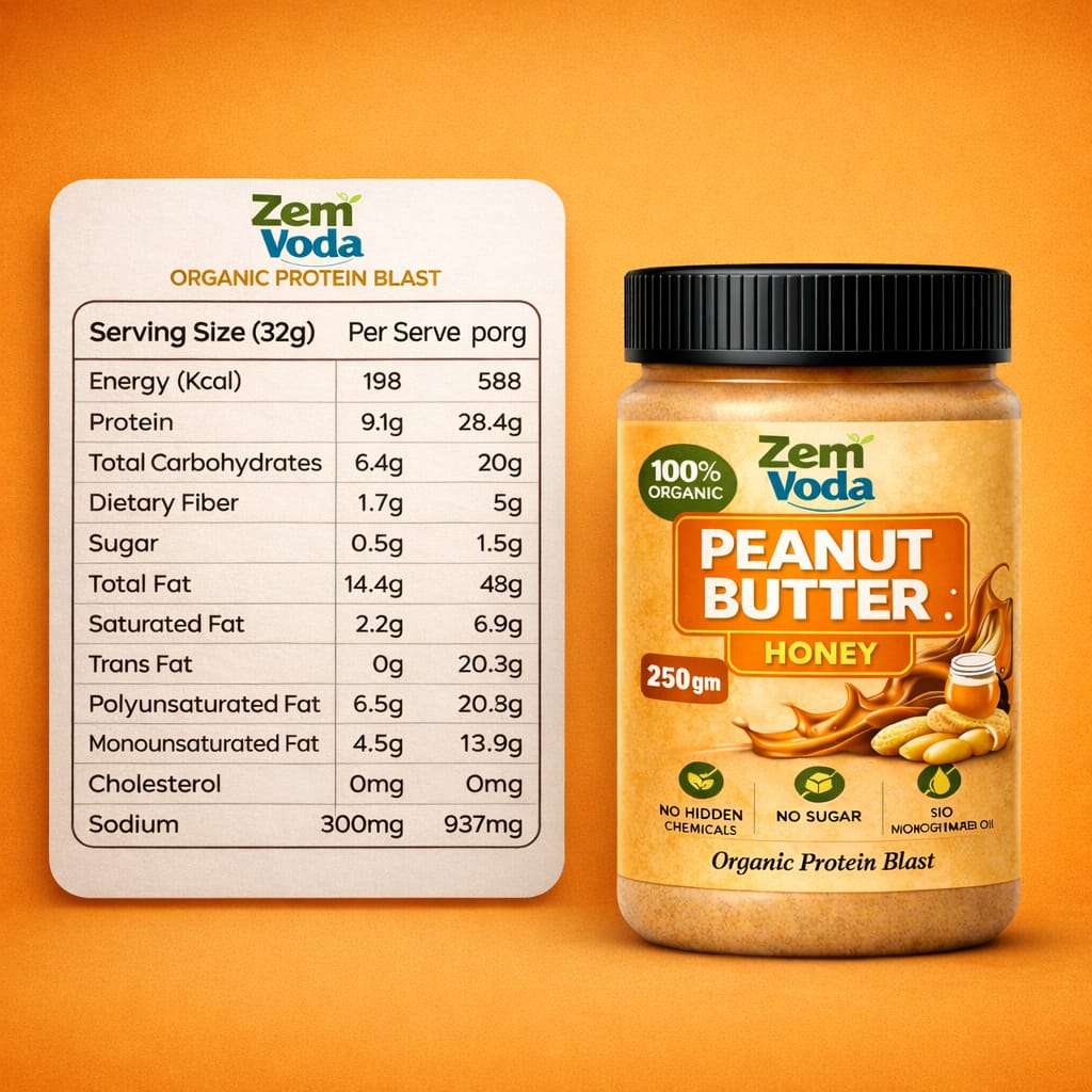 Zem Voda Organic Peanut Butter with Honey aik healthy, natural aur protein-rich spread hai jo 100% organic peanuts aur natural honey se tayar kiya gaya hai. Is mein koi added sugar, hidden chemicals ya hydrogenated oil shamil nahi, is liye yeh fitness lovers, gym users aur healthy lifestyle follow karne walon ke liye perfect choice hai.